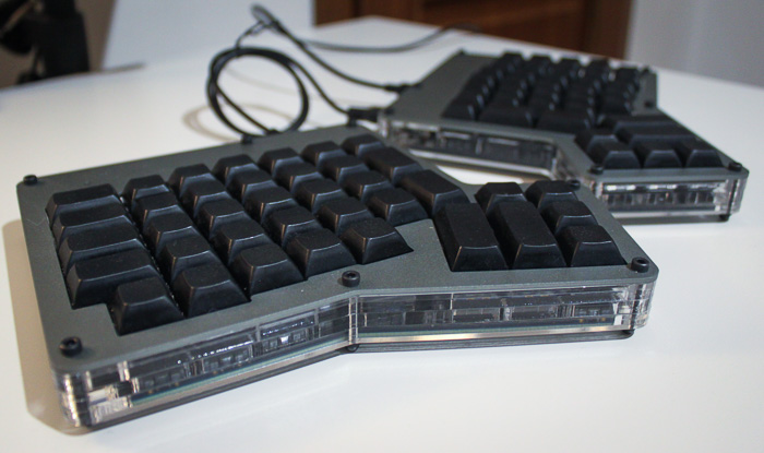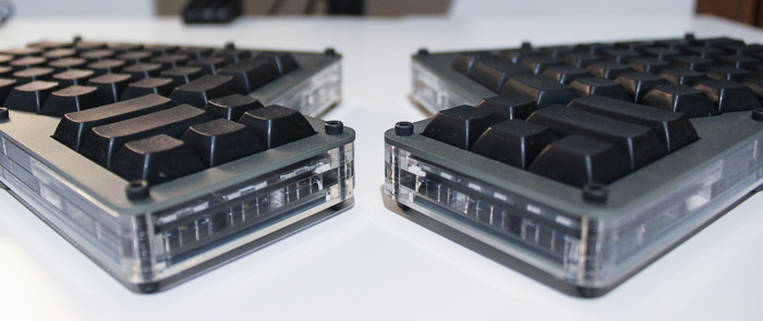 The keyboard itself accommodates approximately 76 keys. The size of keycaps may vary according to function and position. Keycaps can be repositioned according to preference and keys themselves—thanks to a Teensy 2.0 AVR Microcontroller—can be remapped to accomplish different layouts—QWERTY, Dvorak, Colemak, etc.—and/or personal preferences.